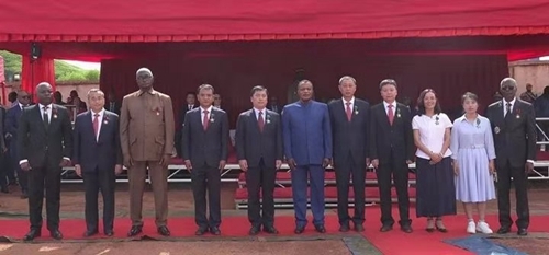 刚果(布)总统德尼·萨苏·恩格索(左起第六位)亲自为做出杰出贡献的索瑞米公司管理人员颁授国家级勋章。