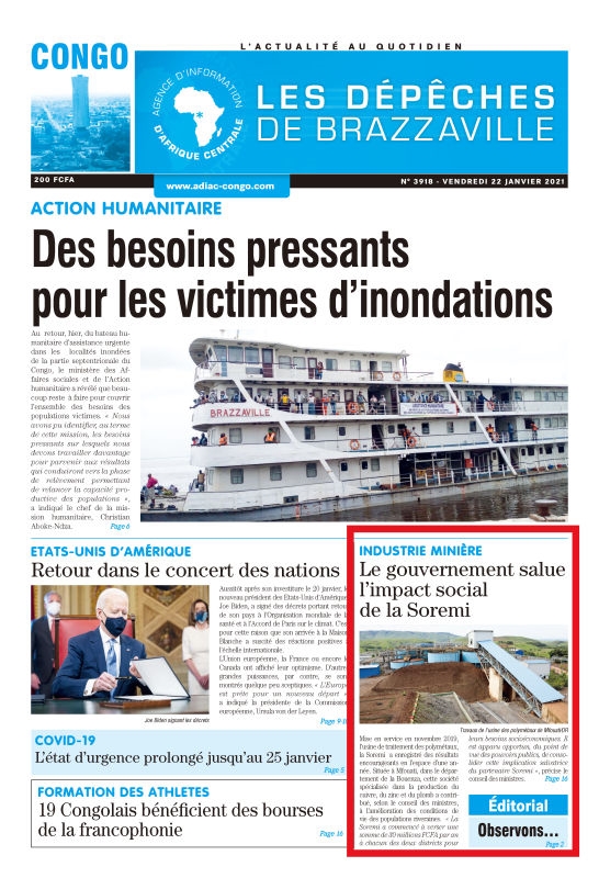 1月22日,刚果(布)发行量最大报纸《布拉柴维尔快讯》头版发表文章《索瑞米项目成绩喜人》,就内阁会议高度评价3044永利集团索瑞米公司履行社会责任进行报道。