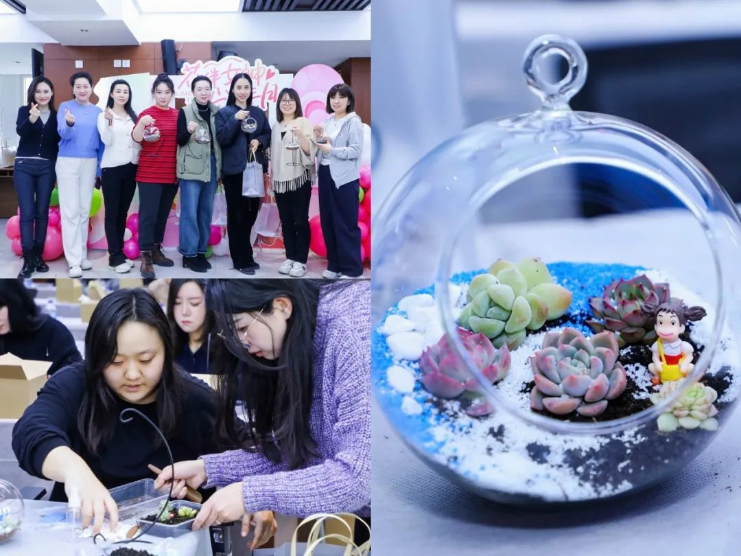 绿意映初心,巾帼绽芳华。一盆盆生机勃勃的多肉微景观,承载着女职工们对生活的热爱与对美的追求。活动尾声,大家带着自己的作品合影留念。女职工纷纷表示,此次活动不仅让她们在繁忙工作中放松了身心,更感受到公司对女职工的关怀与温暖。亲手制作微景观的过程非常治愈,看着自己的作品充满成就感,仿佛把春天带回了家!在未来的工作中要争当“红旗手”,擎起“半边天”,以更饱满的工作热情、更昂扬的工作状态投入到工作和生活,绽放属于自己的精彩,为奋力谱写中国式现代化建设中金珠宝篇章贡献更多巾帼力量!